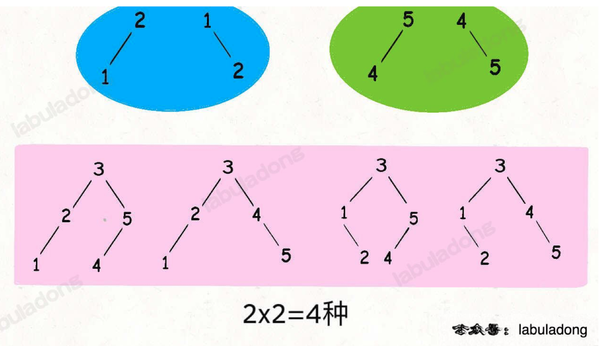 如果固定3作为根节点,左子树节点就是 {1,2} 的组合,右子树就是 {4,5} 的组合。