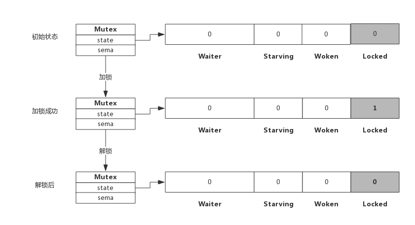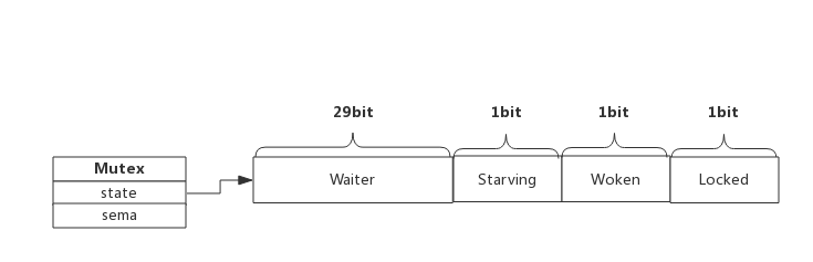 从结构体定义可知,Mutex.state 是32位的整型变量,内部实现时把该变量分成四份,用于记录 Mutex 的四种状态。