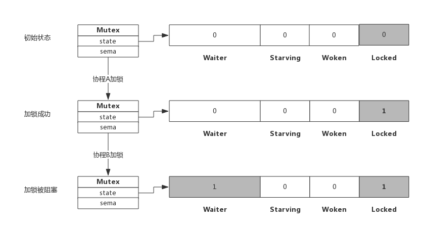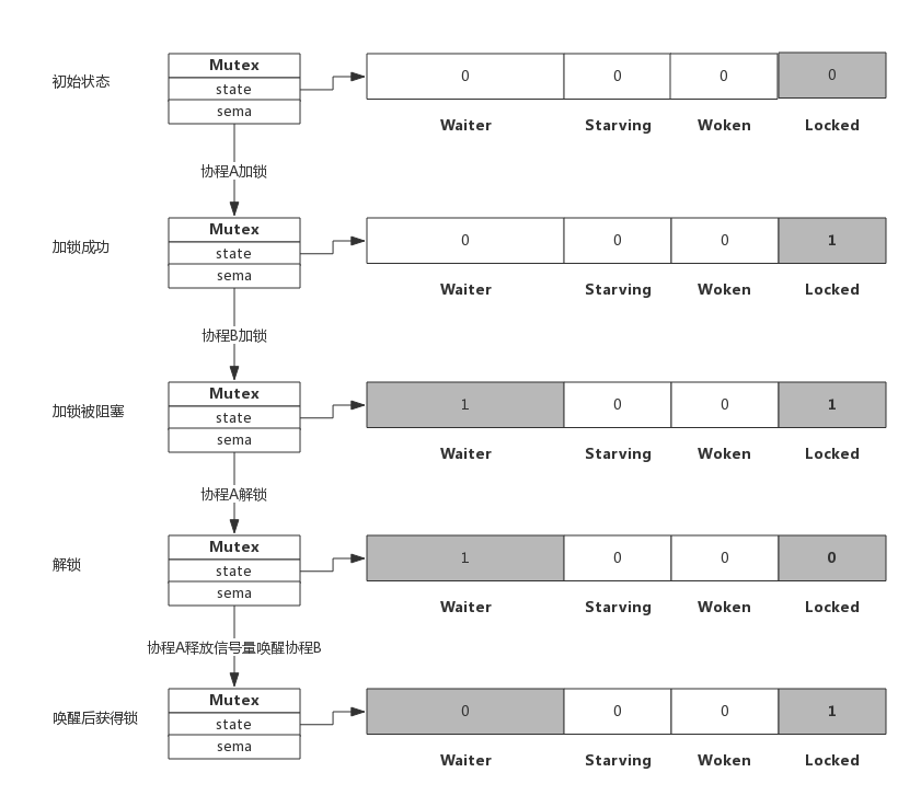 说明: 当协程B对一个已被占用的锁再次加锁时,Waiter 计数器增加了1,此时协程B将被阻塞,直到 Locked 值变为0后才会被唤醒。
