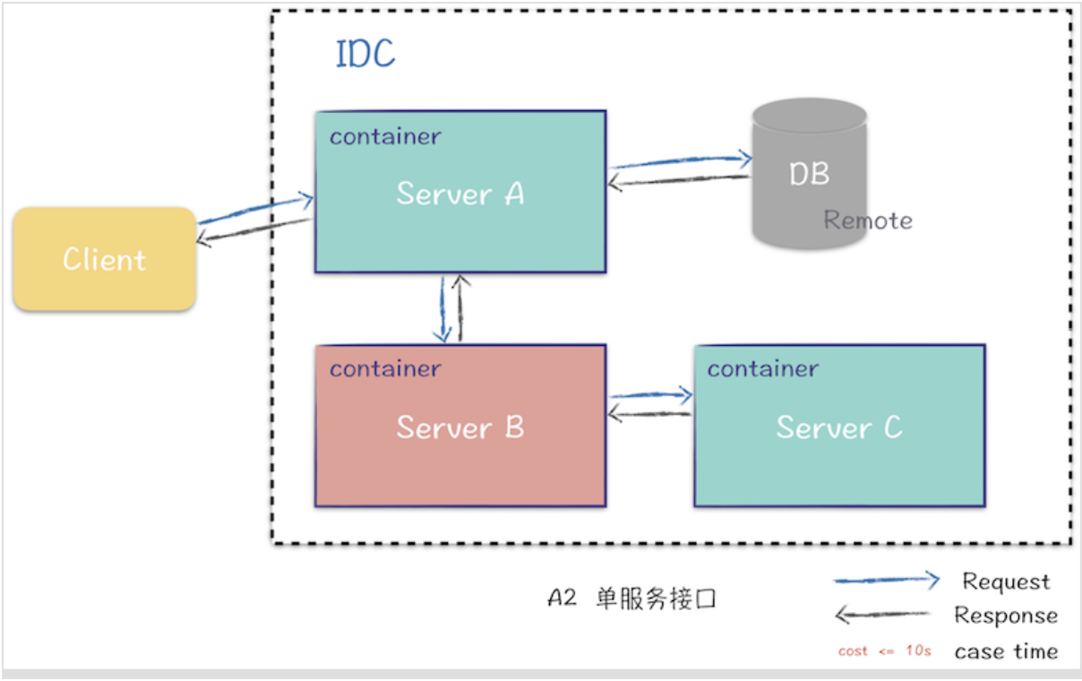 | A2 | 单服务接口 | <=10S | 中 | 不同进程(同/不同机器) | 依赖 | 建议依赖非替身 | 访问网络数据库 | 需要 | 黑盒测试 |