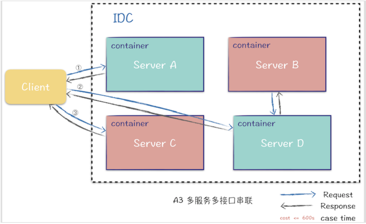 | A3 | 多服务多接口串联场景 | >=1S 建议控制在 10 分钟以内 | 中 | 不同进程/不同机器 | 依赖 | 依赖非替身 | 访问网络数据库 | 需要 |